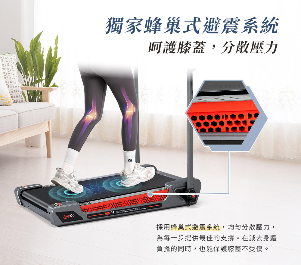 對於有膝蓋或背部問題的使用者,避震功能尤為重要;應該購買一台減震吸收效果非常好的跑步機。避震應用的技術除了單純加上跑步板下方避震墊之外,也會有針對車架,跑板等多重避震技術。跑步機配備的避震技術有助於減少運動時對關節的衝擊,提供更舒適的使用體驗。