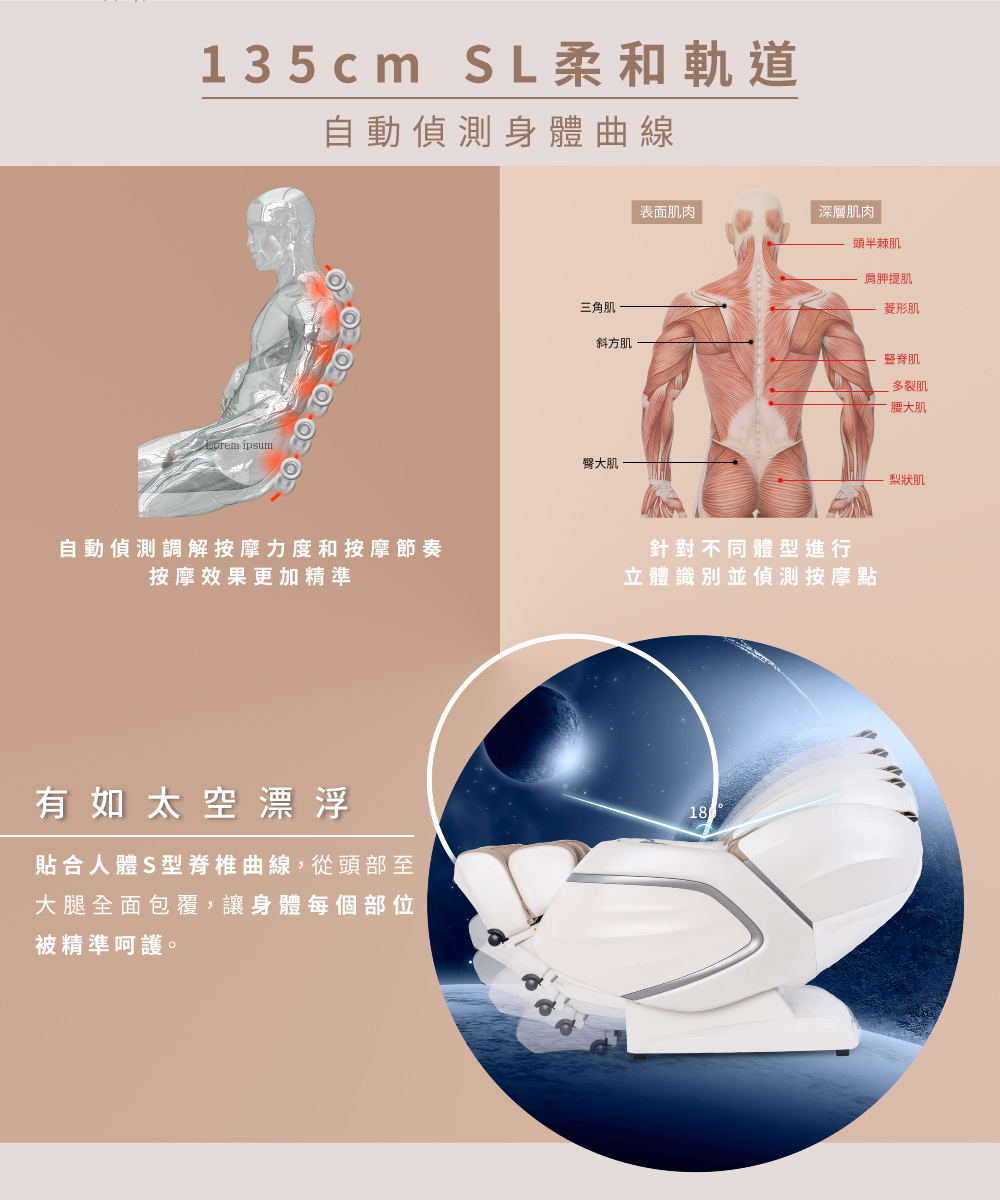 透過零重力功能,按摩椅可移動至緩解壓力的傾斜位置,這對脊椎和關節提供額外的保護。