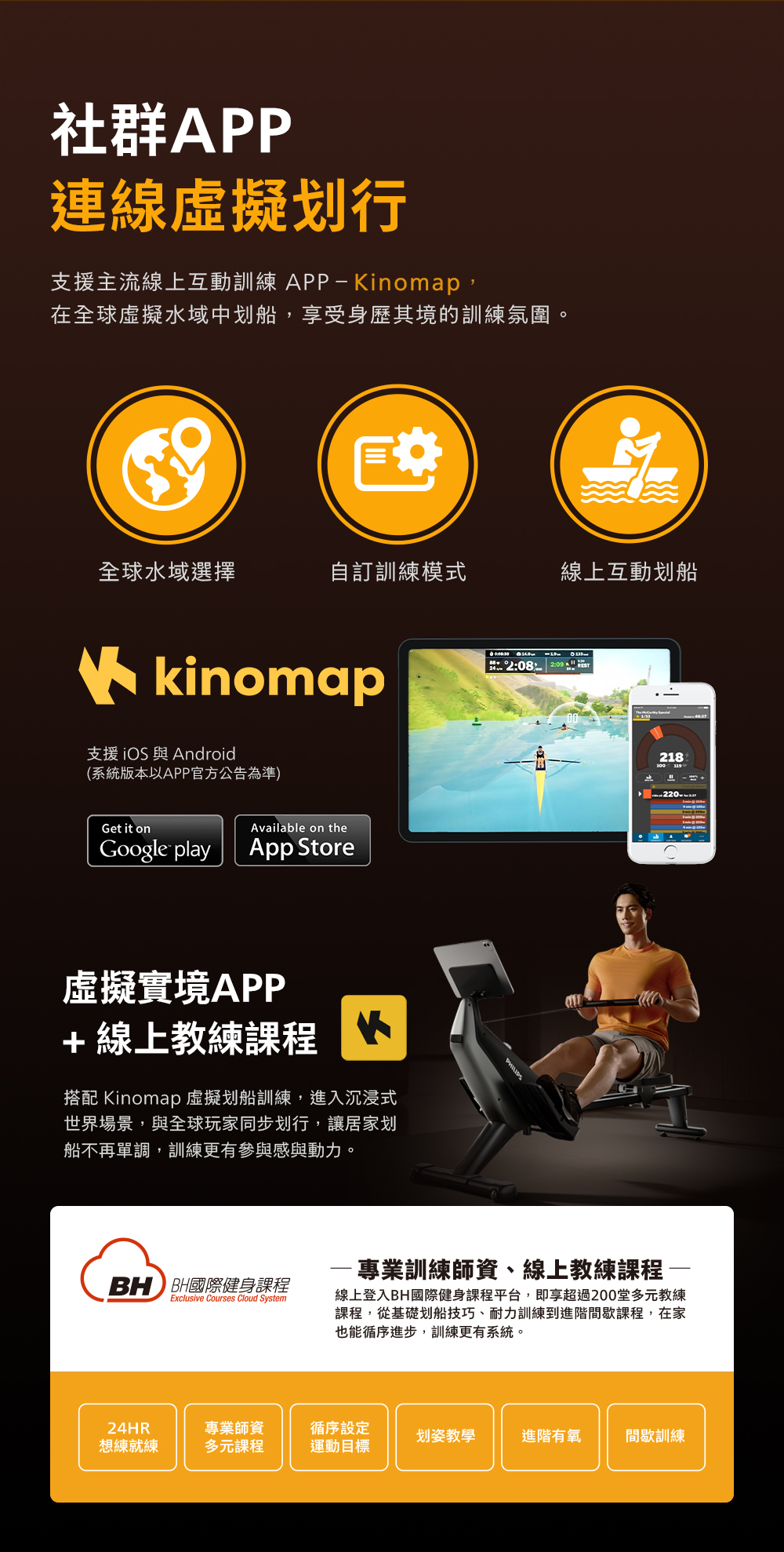 一個大而易讀、易操作的電子錶能大幅提升訓練體驗。推薦選擇配有訓練程式的划船機,方便設定訓練目標。一些機型還能連接第三方應用程式,如Kinomap、EXR等,進行數據傳輸與互動訓練。這些應用程式為國際知名的運動平台,提供豐富的訓練內容與社群互動功能,並具備自己的訂閱系統,讓您的運動更加有趣且富有挑戰性。