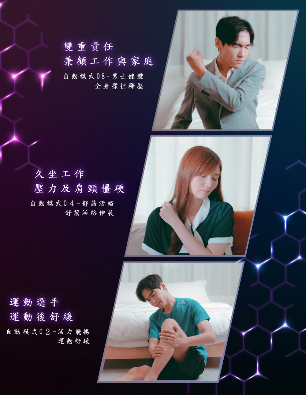 減輕壓力與放鬆心情:按摩椅能模擬專業按摩師的手法,有助於釋放壓力、放鬆身心,達到舒緩焦慮與提升情緒的效果。