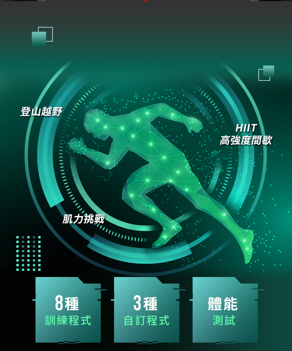 訓練程式:多樣化的訓練模式能滿足不同的健身需求,個人化程式則可根據個人習慣進行自定義訓練,並儲存你的個人跑步強度變化。