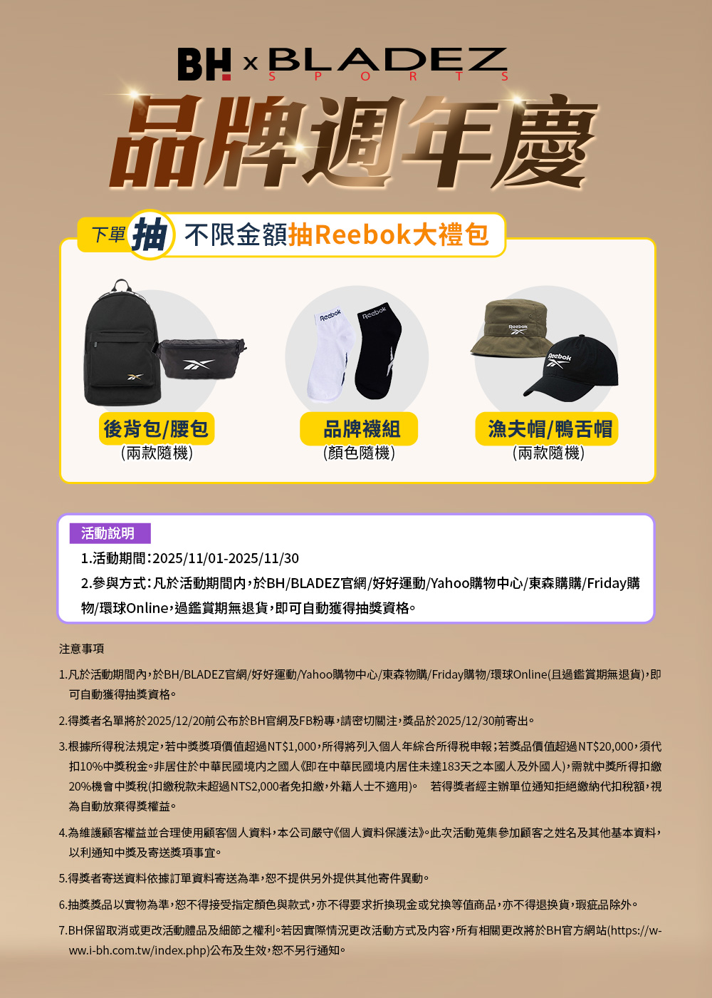 品牌周年慶 下單抽Reebok好禮11/01-11/30