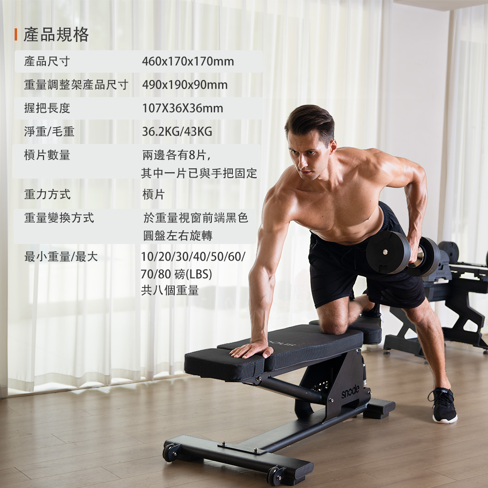 SNODE AD80 80磅可調啞鈴 - 專為現代健身打造可調重量範圍廣,滿足從初學者到專業健身者的需求。簡單操作,快速調整重量,提升訓練效率。