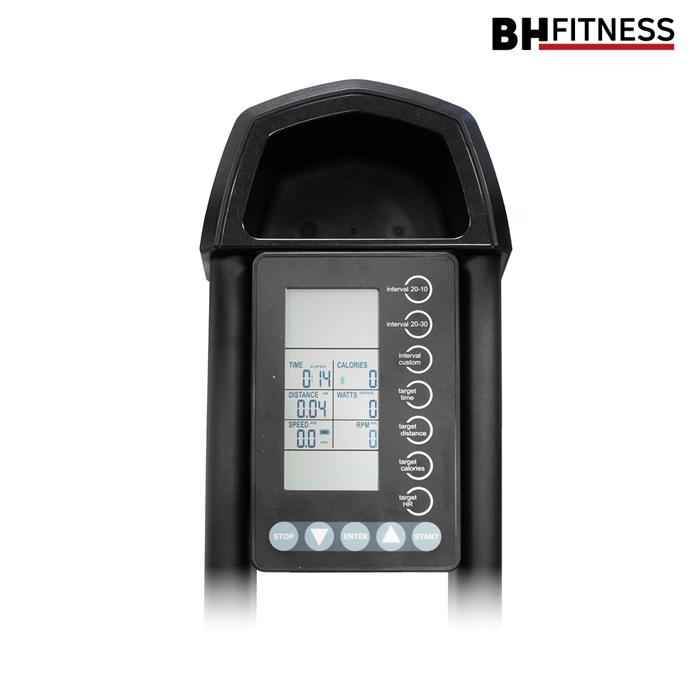 具備大按鍵設計與多項運動數據顯示(時間、速度、RPM、距離、功率、卡路里、心率、HRC),操作簡易、資訊一目了然。