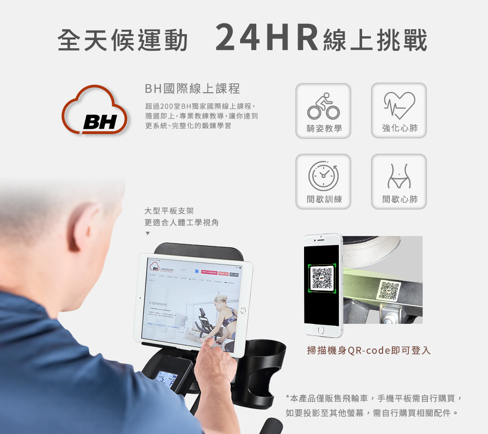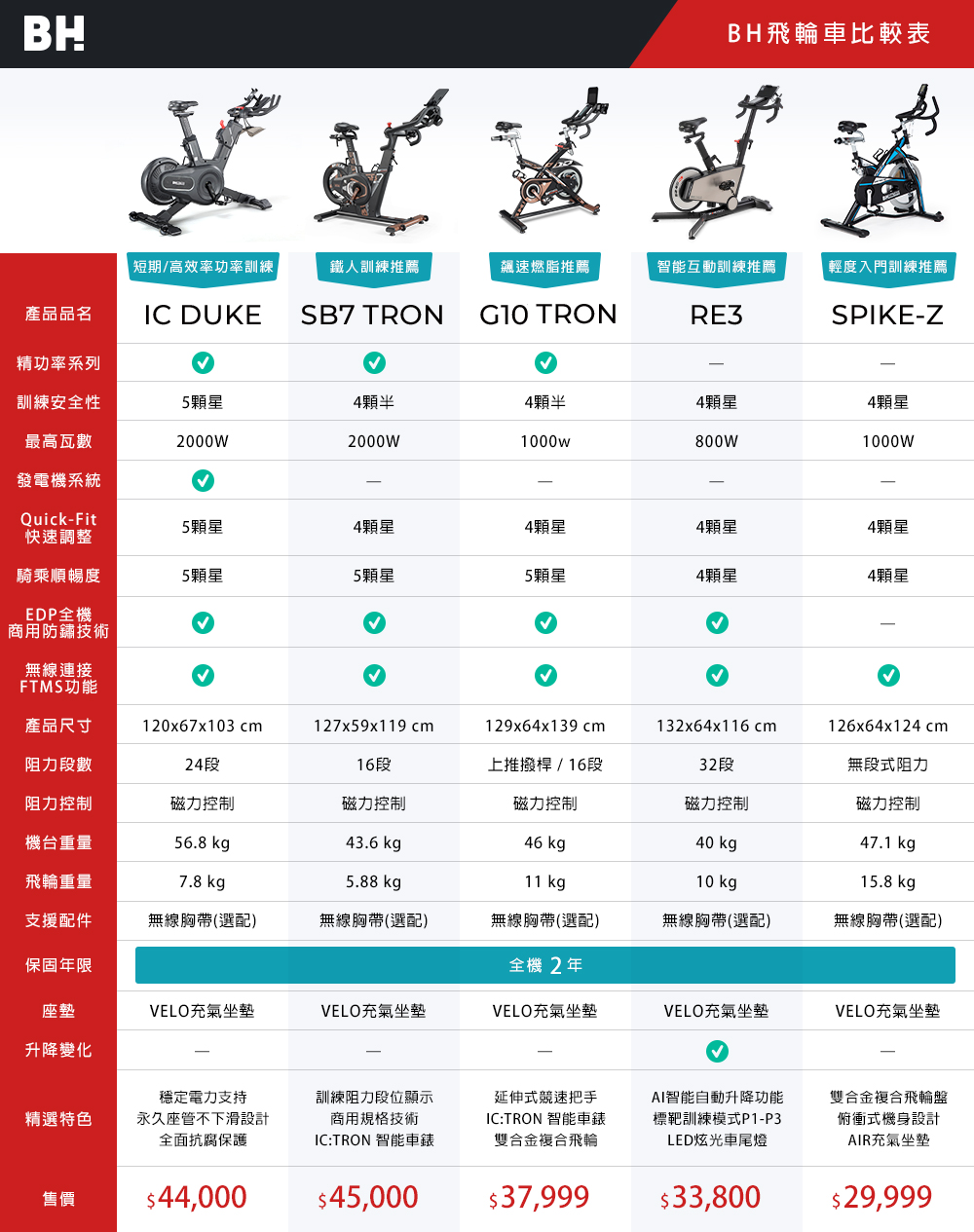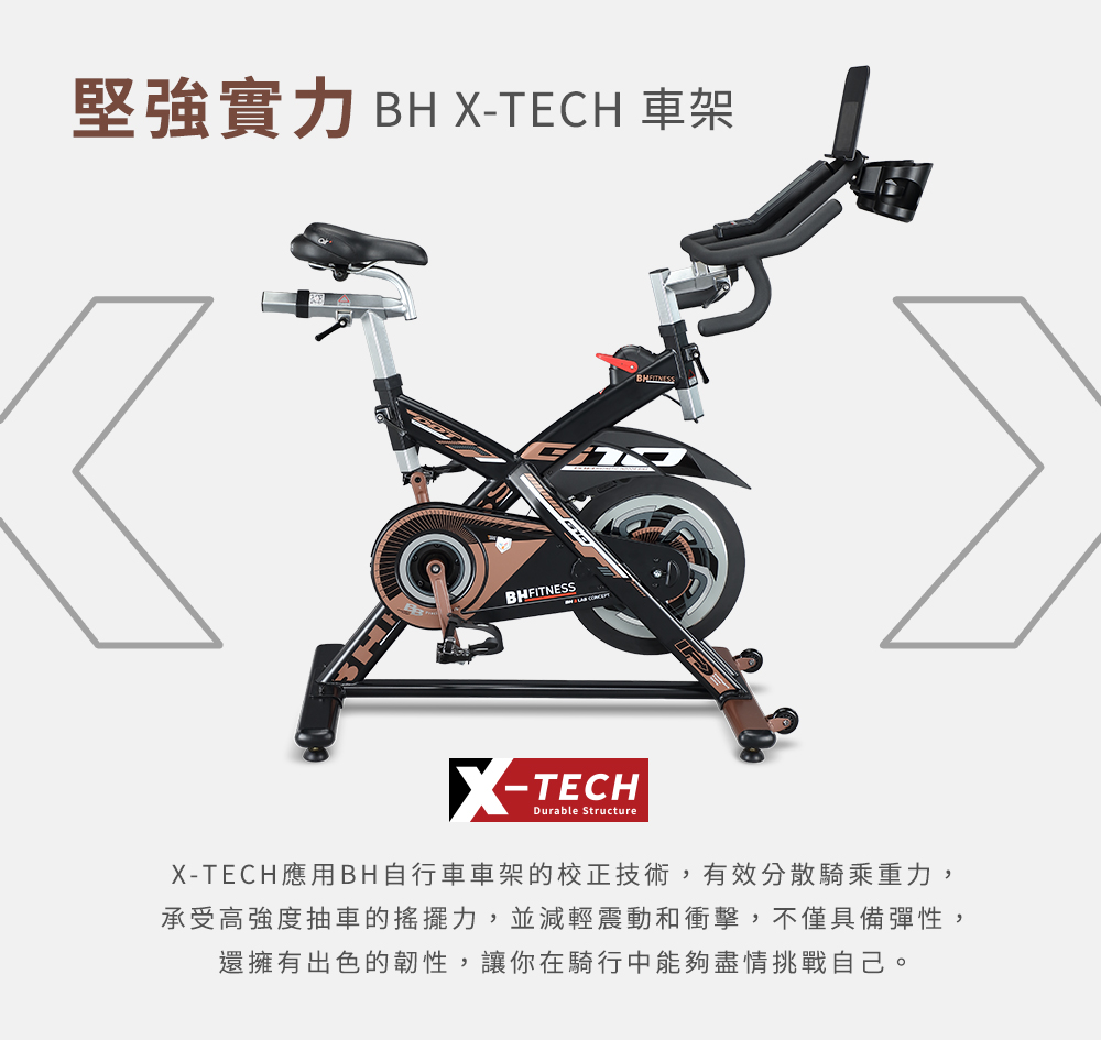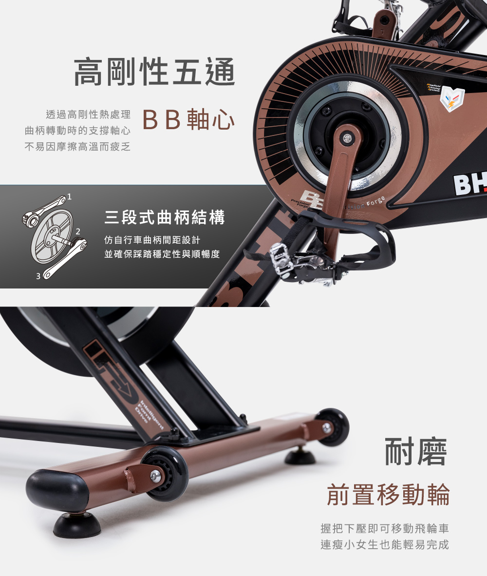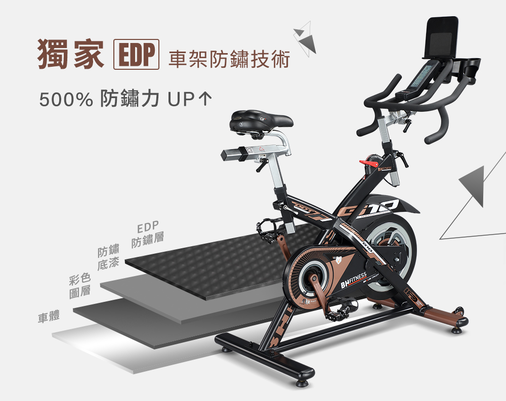 應用世界三大環賽的參賽技術經驗,BH在單身訓練的產品技術是世界前沿的技術,飛輪車和智能單車都是BH競賽技術應用的體現產品,提供健身和單車訓練的專業需求,在全車身EDP塗層應用,人因工程幾何設計、傳動整合以及雲端科技應用,屬於BH飛輪車產品的優勢。