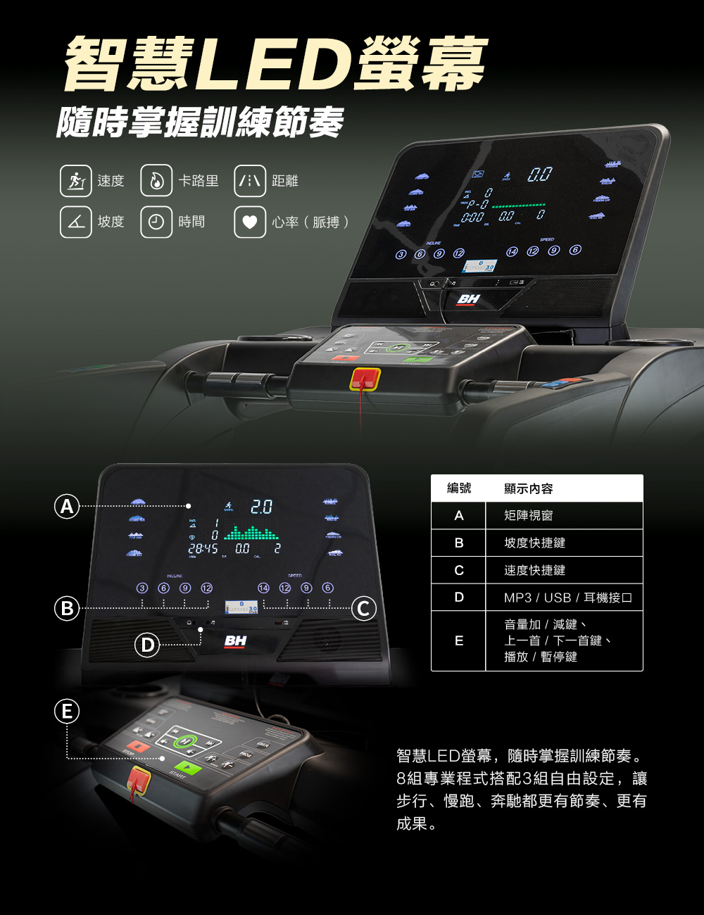 心率控制:從圖表中選擇適合透過年齡、性別和期望訓練目標(耐力增加、脂肪燃燒等)進行脈搏控制的模型的適當心率值,跑步機自動調整速度與傾斜角度,保持最佳運動狀態。