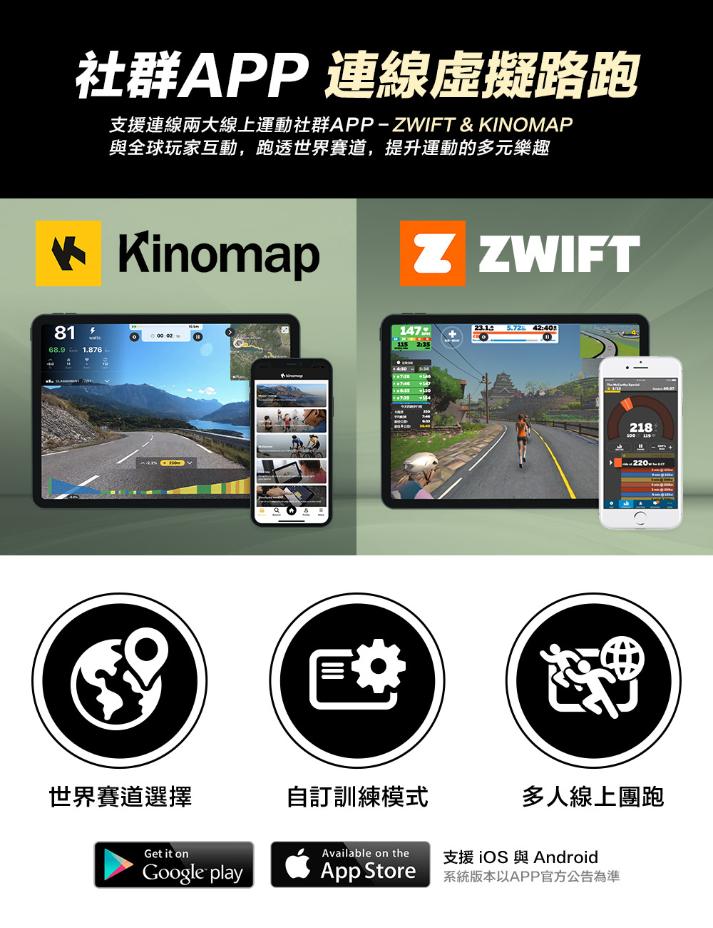 如果您喜歡互動式訓練,只需選擇支援FTMS藍牙協定的跑步機,即可連接第三方應用程式,如Zwift、EXR、Kinomap等,進行數據傳輸與互動訓練。這些應用程式為國際知名的運動平台,提供豐富的訓練內容與社群互動功能,並具備自己的訂閱系統,讓您的運動更加有趣且富有挑戰性。