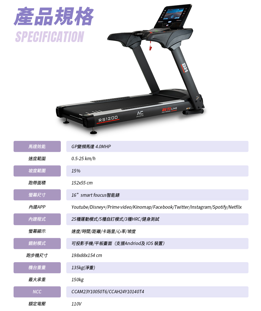 預購【BH】RS1200 TFT 智能變頻跑步機