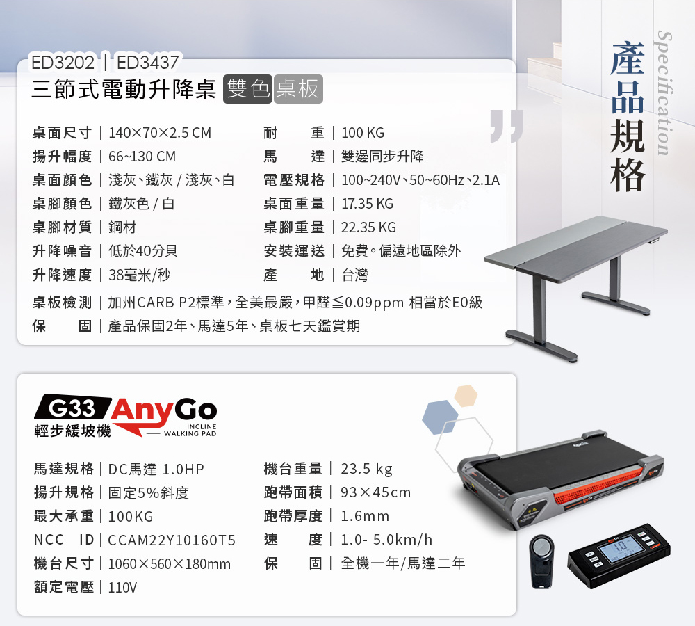 【BH】居家智能運動組合(G33 Any Go輕步緩坡機+ED3202三節式電動升降桌-雙色桌板)